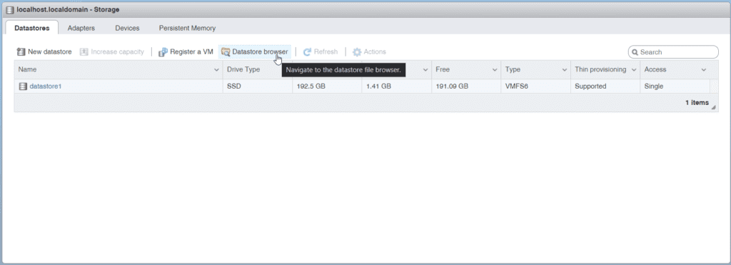 Van hier uit kunnen we naar de “Datastore Browser” gaan, hier kunnen we bestanden plaatsen die belangrijk zijn voor de server, zoals installatie bestanden zoals de ISO van Ubuntu Server. Klik nu op “Datastore Browser“, de browser zal nu open gaan.