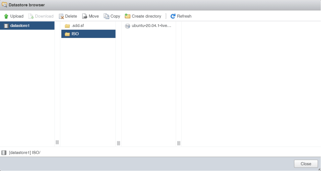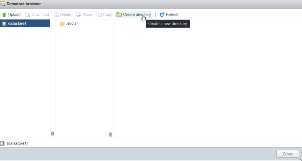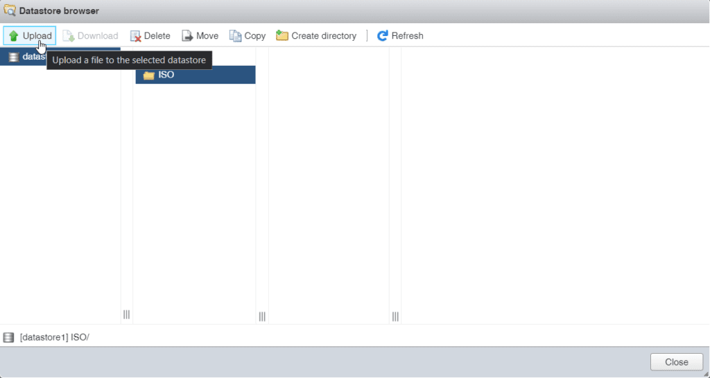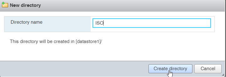 In de Datastore Browser gaan we een nieuwe “Directory” aanmaken met de naam ISO, hier kunnen we dan onze ISO opslaan zodat we deze meerdere keren kunnen gebruiken om Virtuele Machines aan te maken. Klik bovenaan op “Create Directory“, Geef je “Directory name” in en klik dan op de knop “Create directory”