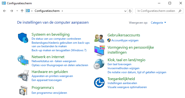 Om Hyper-V te installeren heb je Windows 10 Professional nodig, op de Home kan je deze niet installeren. Om deze feature te installeren ga je naar het “Configuratiescherm” of “Control Panel”.