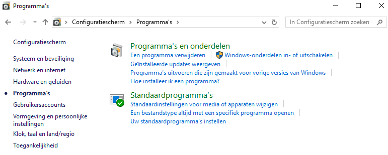 In het “Configuratiescherm” kies je voor “Programma’s”.