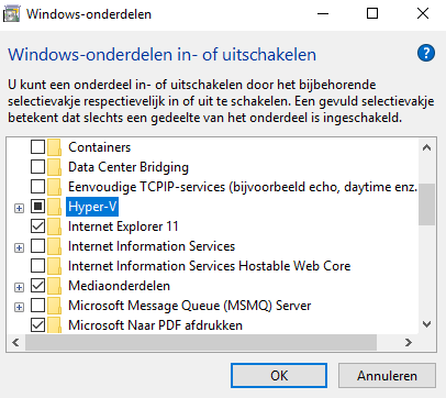 Nu krijg je een menu van alle Windows-onderdelen, hier ga je Hyper-v aanvinken en op OK drukken.