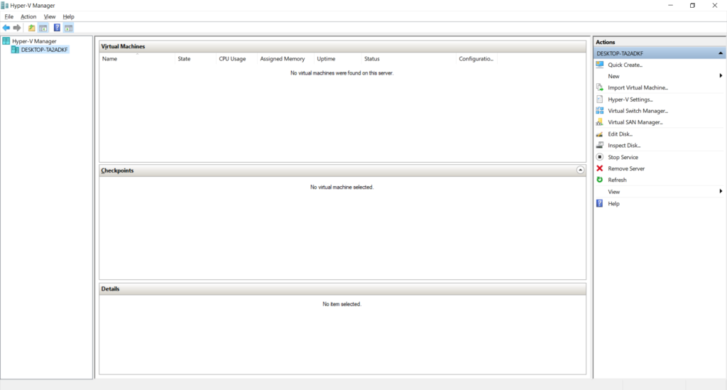 De rechter Kolom: Ook bekend als het Actions Pane: Hierin kun je snelle links naar de meest gebruikelijke onderdelen van Hyper-V vinden.