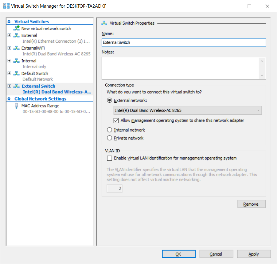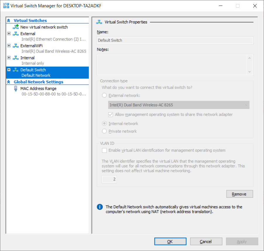Default Switch: Deze switch wordt automatisch aangemaakt tijdens de installatie van Hyper-V. Deze is als enige een switch die aan Network Address Translation doet. Deze combineert eigenschappen van de internal en external switch, maar geeft minder ruimte om zelf instellingen te doen.