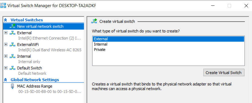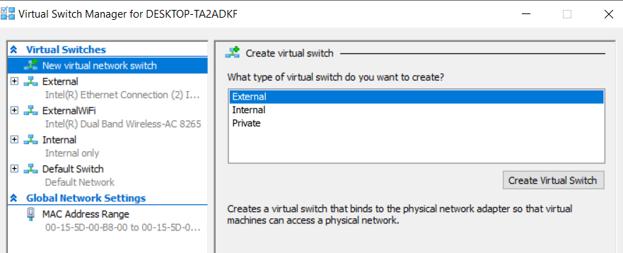 Kies voor “External” en dan de knop “Create Virtual Switch”: