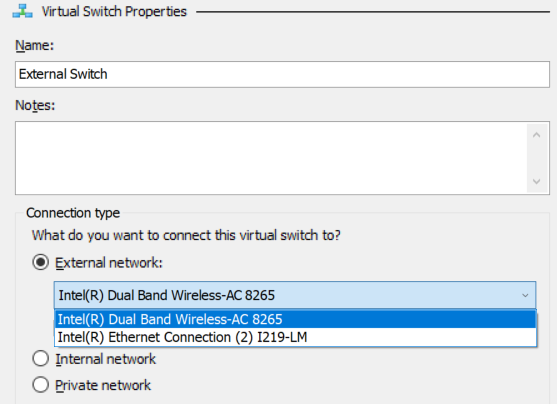 External Switch: Deze switch heeft een binding met de fysieke netwerk adapter en zorgt ervoor dat je VM zich gedraagt als een toestel in het fysieke netwerk.