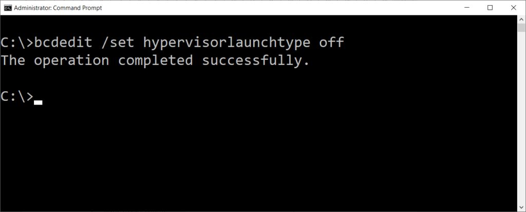 Geef het commando: bcdedit /set hypervisorlaunchtype off