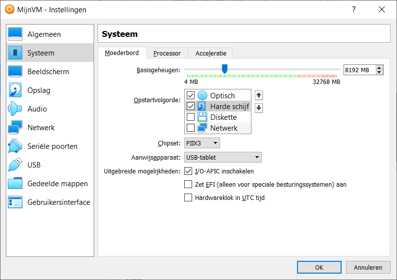 In het tabblad “systeem” kun je alsnog het RAM-geheugen wijzigen en de boot priority aanpassen. Stel dit in naar de benodigdheden.