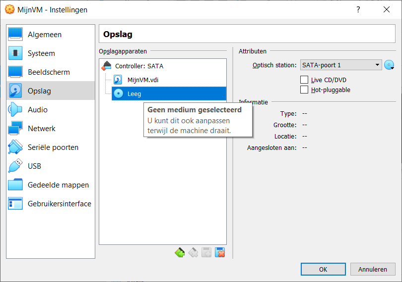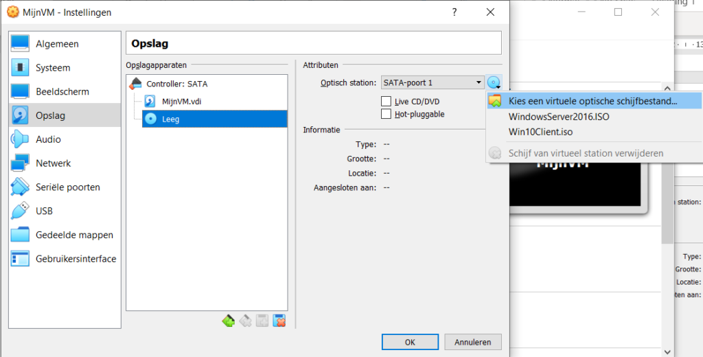 In het tabblad “Opslag” zie je de eigenschappen van he Virtuele Harde Schijf. Je kan er eveneens een .ISO bestand aan je DVD drive koppelen door op het blauwe disk symbool rechts te klikken.