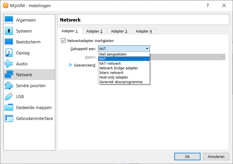 In het “netwerk” tabblad kun je kiezen met welk soort netwerkadapter je je VM zal verbinden.