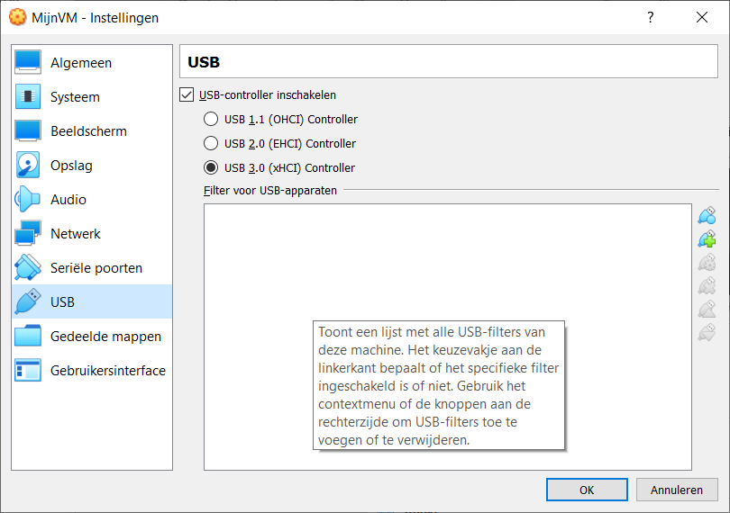 In het volgende tabblad “USB” kun je de USB controller instellen. Deze foutief instellen kan de oorzaak zijn dat je VM niet wil starten.