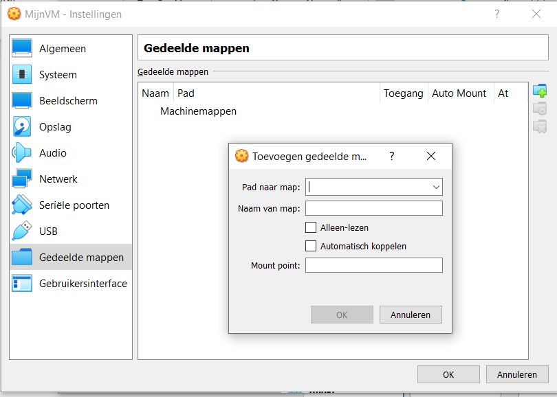 Ten slotte, het tabblad “Gedeelde mappen”. Hier kun je een map toewijzen op je host toestel die gedeeld wordt met je Virtuele Machine.